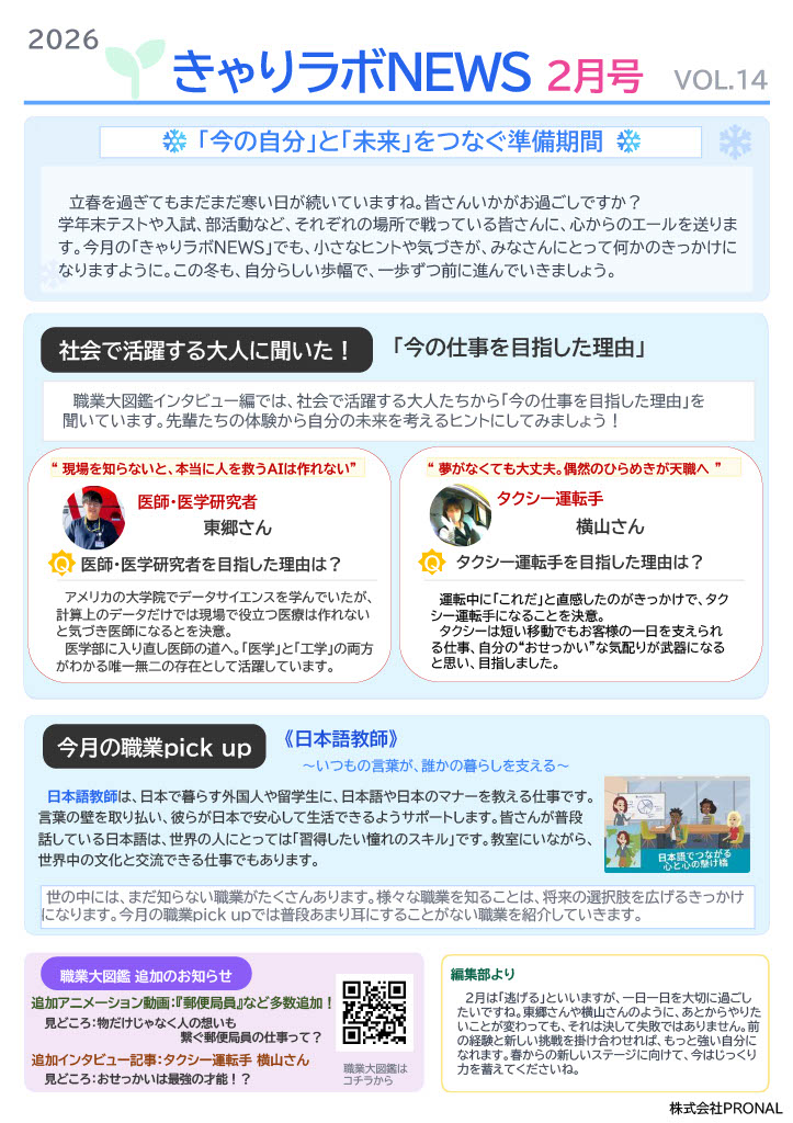 HOMEきゃりラボNEWS【2026年2... きゃりラボNEWS【2026年2月号】発行のお知らせ 2026.02.04 PRONAL ↓↓↓きゃりラボNEWS【2026年2月号】を発行いたしました。是非ご覧ください。↓↓↓ 関連記事 記事はありませんでした